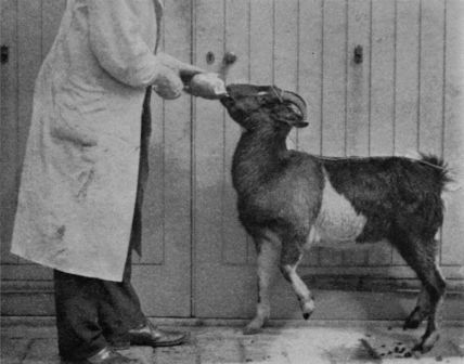 Μία από τις κατσίκες του Haldane μετά από πείραμα. Παρατηρείστε πως λυγίζει το ένα της πόδι  για να ανακουφιστεί από τα συμπτώματα της νόσου των δυτών. Πηγή