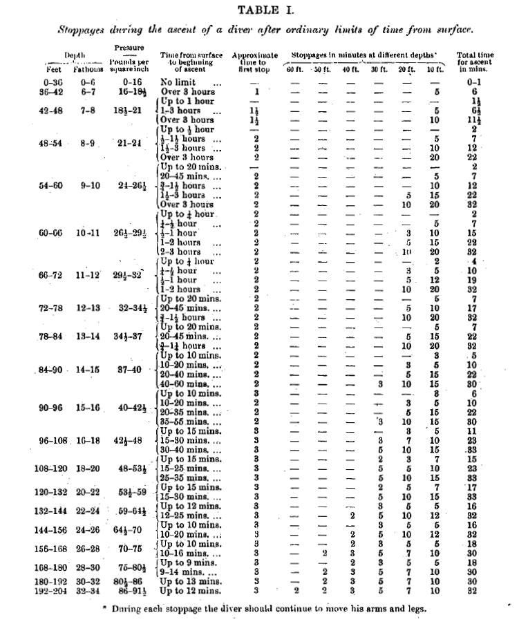 Ο πρώτος πίνακας αποσυμπίεσης του Βρετανικού Ναυαρχείου, εκδόσεως 1908, που δημοσιεύθηκε στο επιστημονικό περιοδικό Journal of Hygiene. Οι σύγχρονοι υπολογιστές καταδύσεων και οι αλγόριθμοί τους έχουν τις απαρχές τους σε αυτόν τον πίνακα.