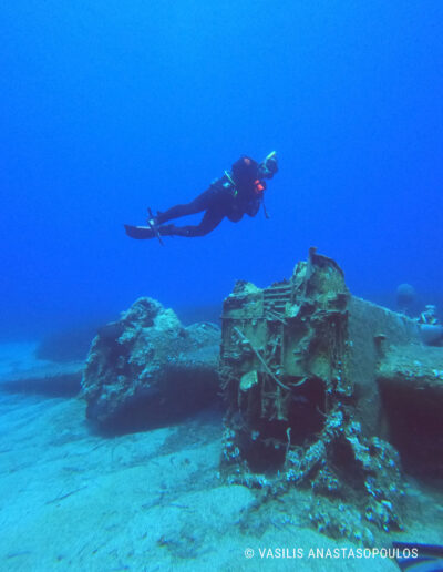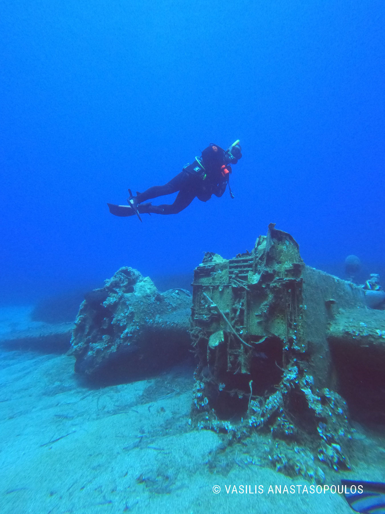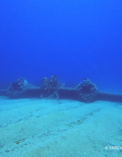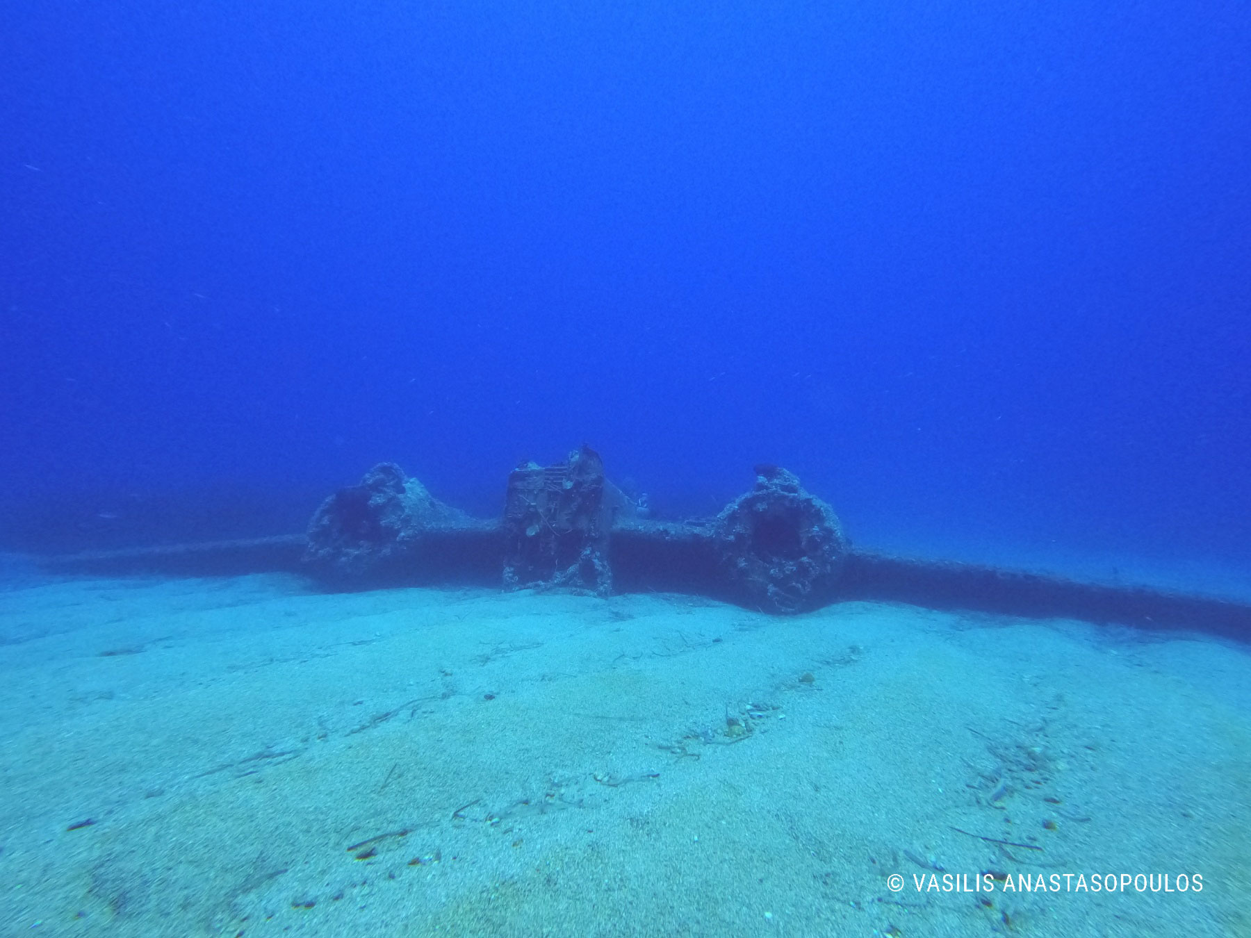 Εντυπωσιακή βουτιά. Ακολουθήστε τον σωλήνα που θα βρείτε στο νερό ο οποίος θα σας οδηγήσει στο ναυάγιο. Θα αντικρίσετε το αεροπλάνο πίσω από κάτι φύκια σε βάθος 18 μέτρων. Το σημείο έχει αρκετή ζωή και ικανοποιητική ορατότητα.